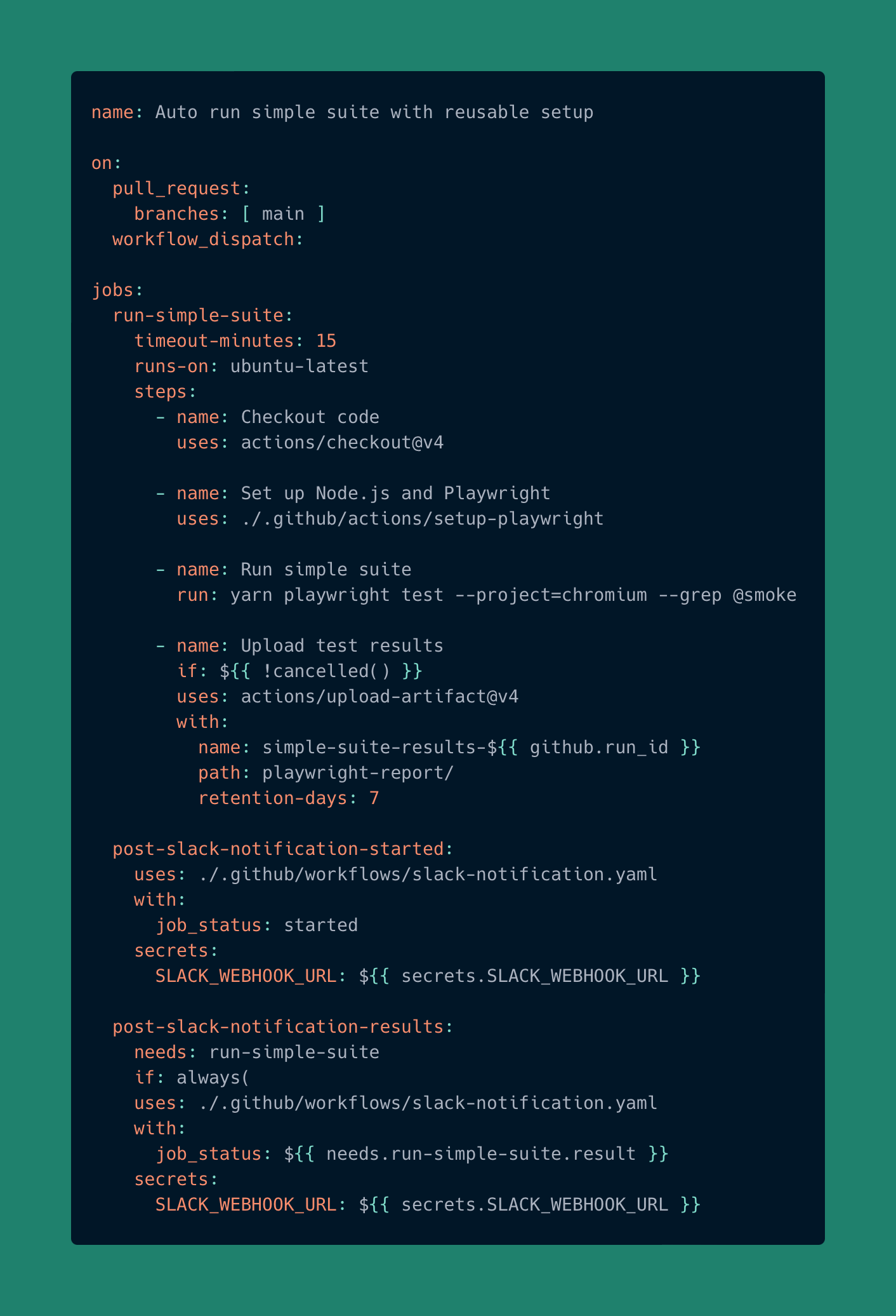 The result is a shorter, more readable pipeline where each job focuses only on what it needs to do — running tests or sending notifications — while the shared logic lives in one place. Updating dependencies, tool versions, or message formats no longer means editing multiple files, making the whole setup more consistent, scalable, and reliable.