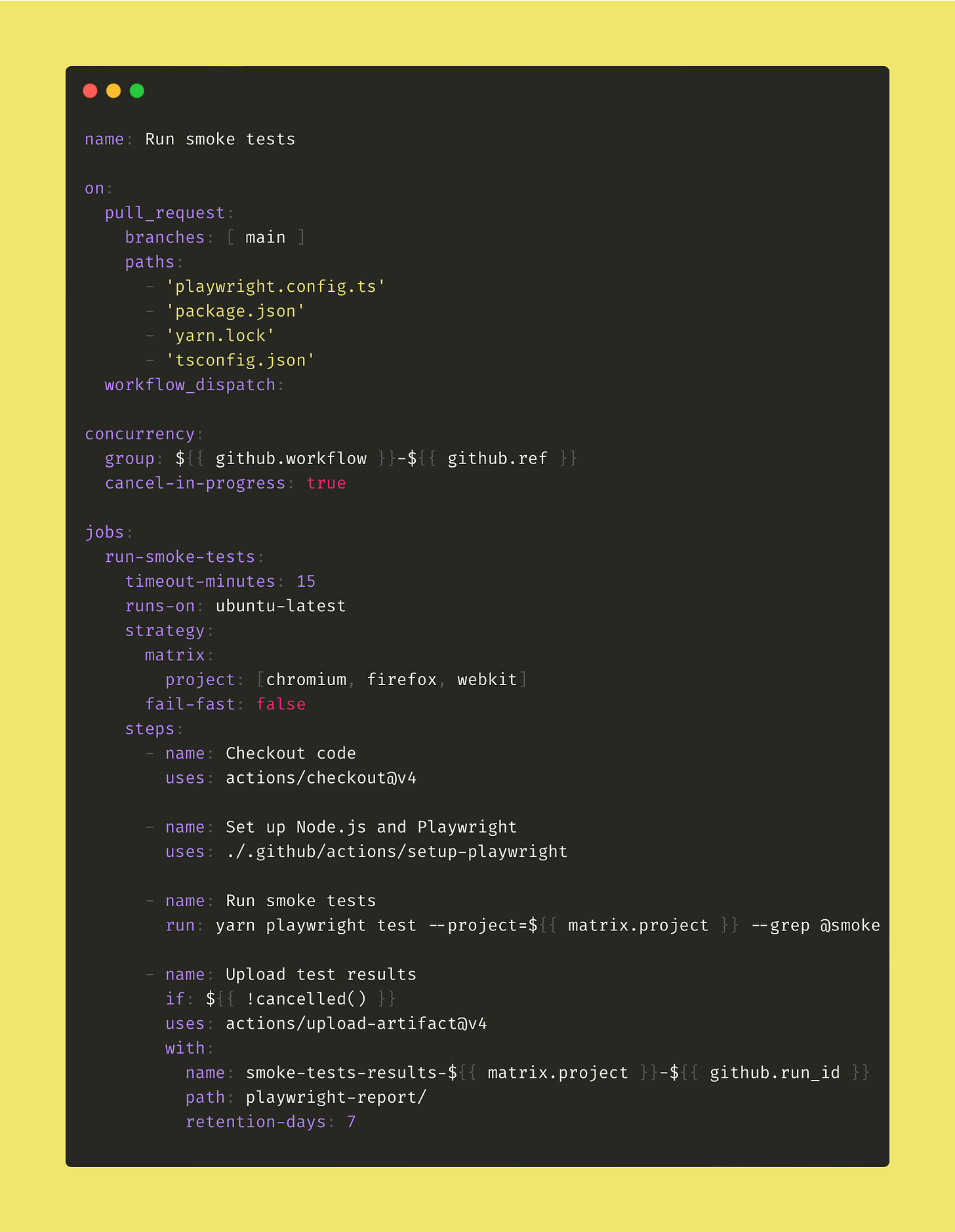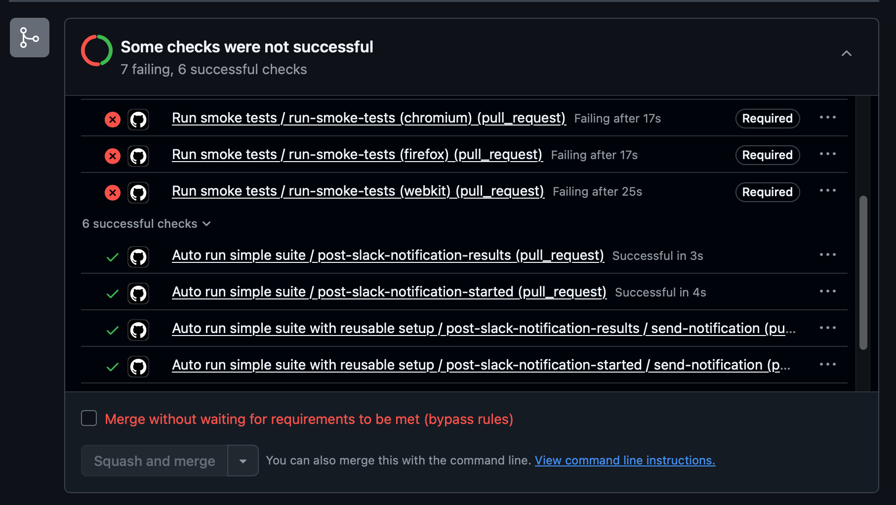 testDir: ‘./non-existent-tests’,If you run the workflow now, the Run smoke tests job will fail, marking the entire pipeline (and the required check) as failed — effectively blocking the PR from merging.